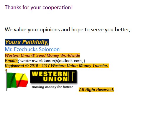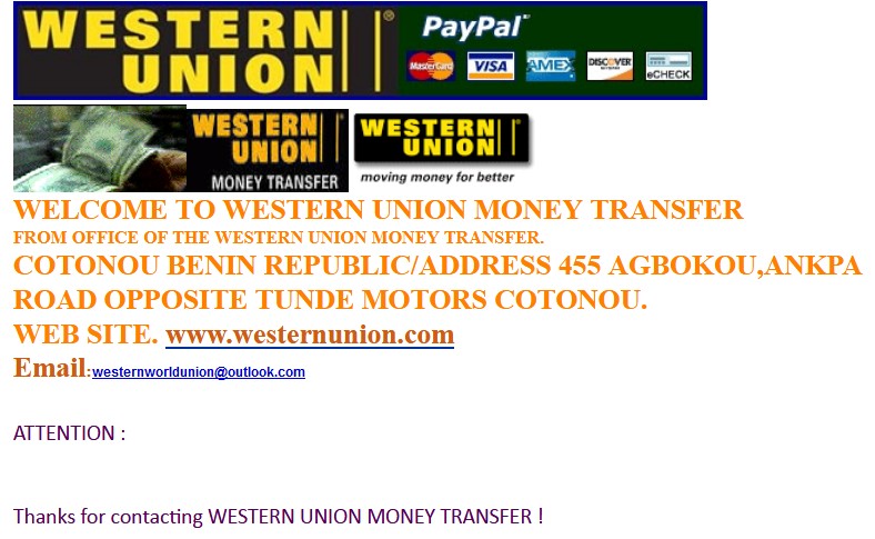 Western union head office cotonou benin republic. Beneficiary i write to inform you that because of your much delay your cheque has been converted and deposited with western union for transfer and they have already sent you 500000usd through western union as they have been given the mandate to transfer your full compensation payment ofusd150000000 via western union money transfer.