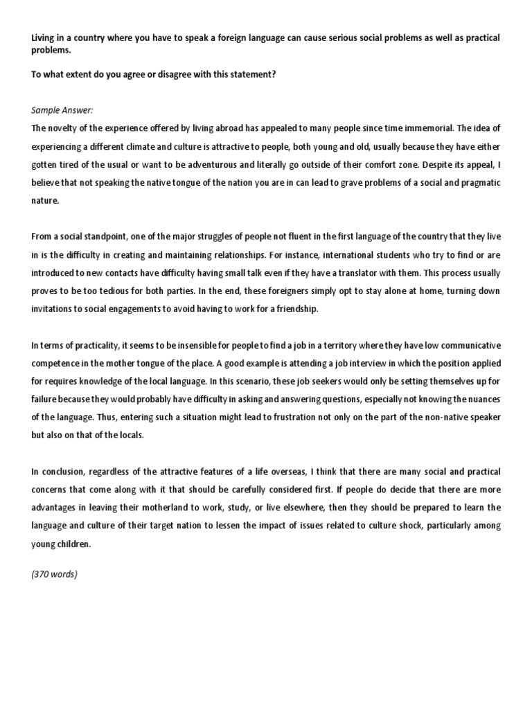 Living In A Country Where You Have To Speak A Foreign Language Can Cause Serious Social As Well As Practical Problems To What Extent Do You Agree Or Disagree With This Statement