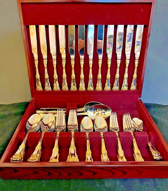 This is the only listing i see at this time for this identical item. Vintage 65 pc gold plated flatware complete set for 12 international china. Country flatware 65 piece set gold plated 22 karat royal albert roses 406 similar old country roses pattern is practically synonymous with the name royal albert and a long standing testament to timeless and elegant craftsmanship.