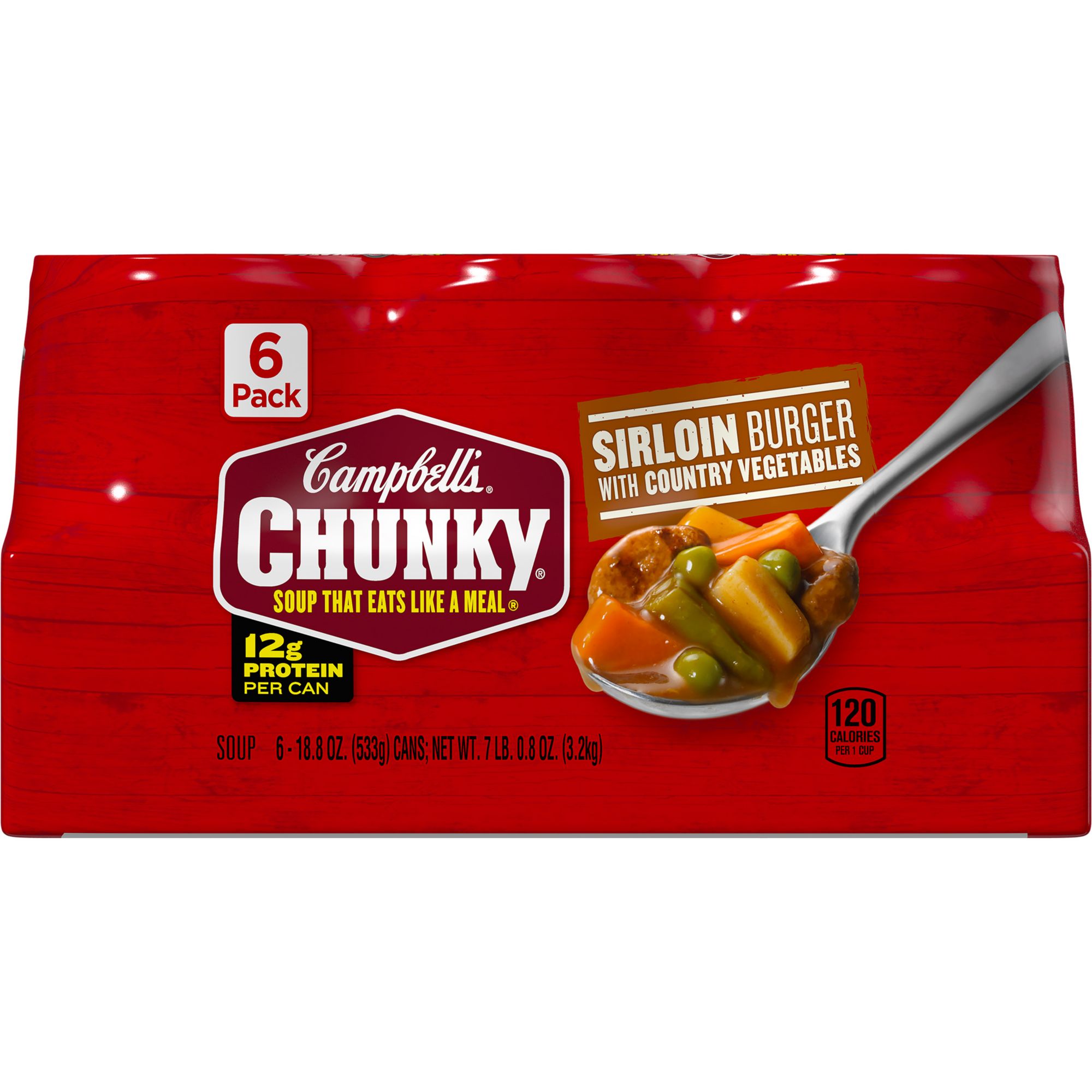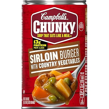 Read honest and unbiased product reviews from our users. Campbells chunky sirloin burger with country vegetables soup features the hearty comfort you crave. Seasoned beef country veggies and loads of flavor make this low fat creation and ready to eat soup something thatll fill you up and keep you coming back for more.