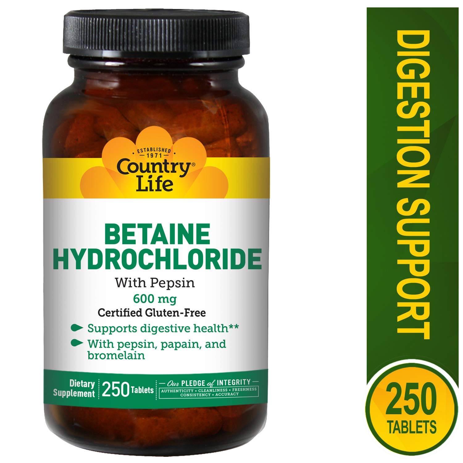 Betaine hydrochloride is a chemical compound that helps support digestion in the stomach by providing a source of hydrochloric acid. Country life betaine hydrochloride with pepsin 600 mg 250 tablets. Country life betaine hydrochloride with pepsin 600 mg 250 tablets.